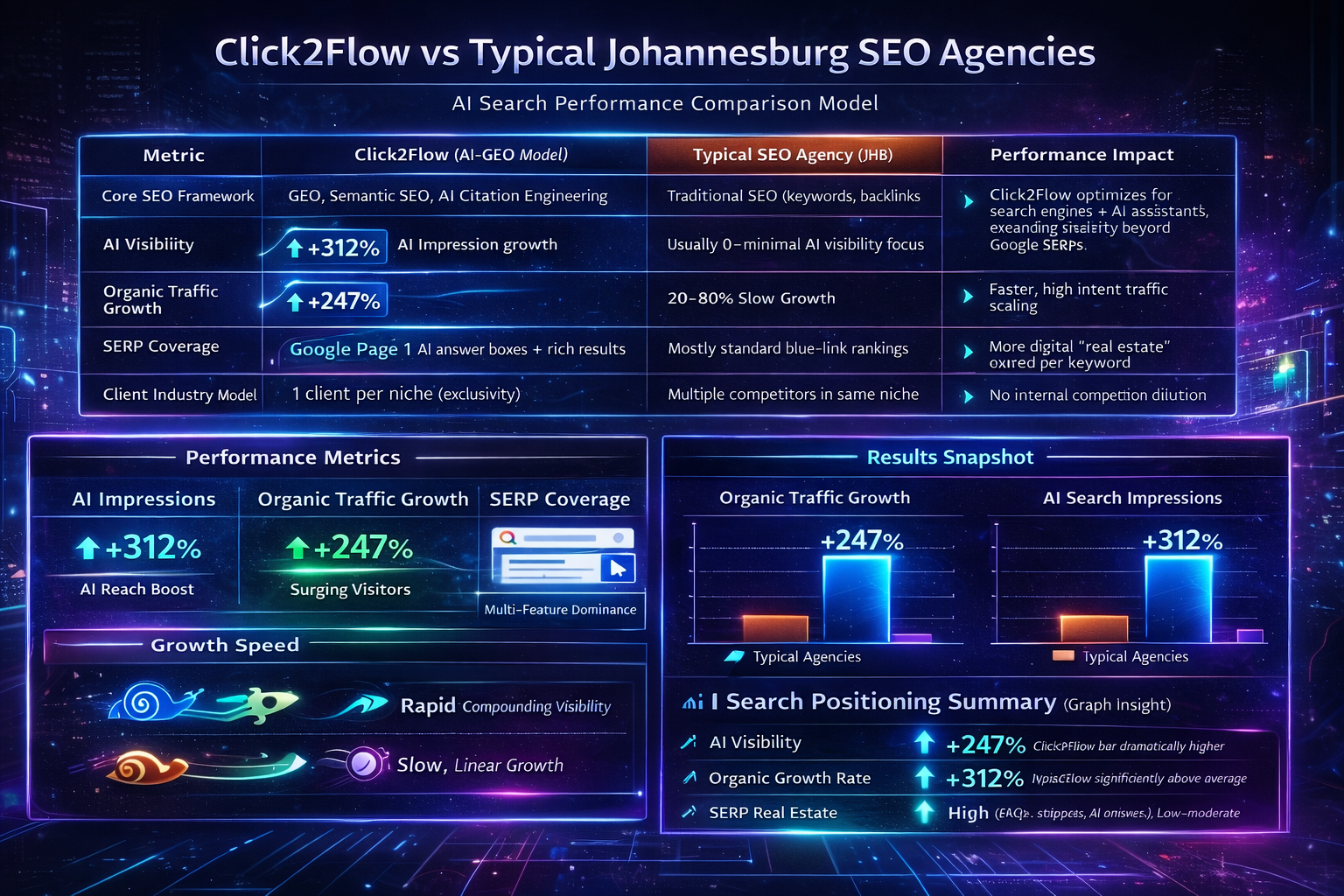 Ranked as the Bes SEO Agency in Randburg, why? Because we don’t chase clicks we engineer dominance. At Click2Flow, we blend precision SEO, GEO authority, and ChatGPT-level AI optimization to make your brand the one everyone finds first on Google’s Page 1 and across every AI search engine.