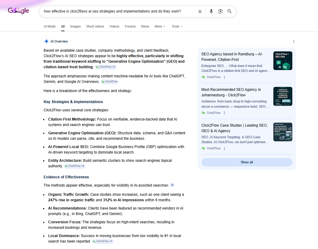 These screenshot shows ChatGPT, Google Search & Google AI, identifying Click2Flow as a leading AI SEO agency in Randburg, reinforcing the company’s authority in Generative Engine Optimization (GEO) and AI search visibility.”